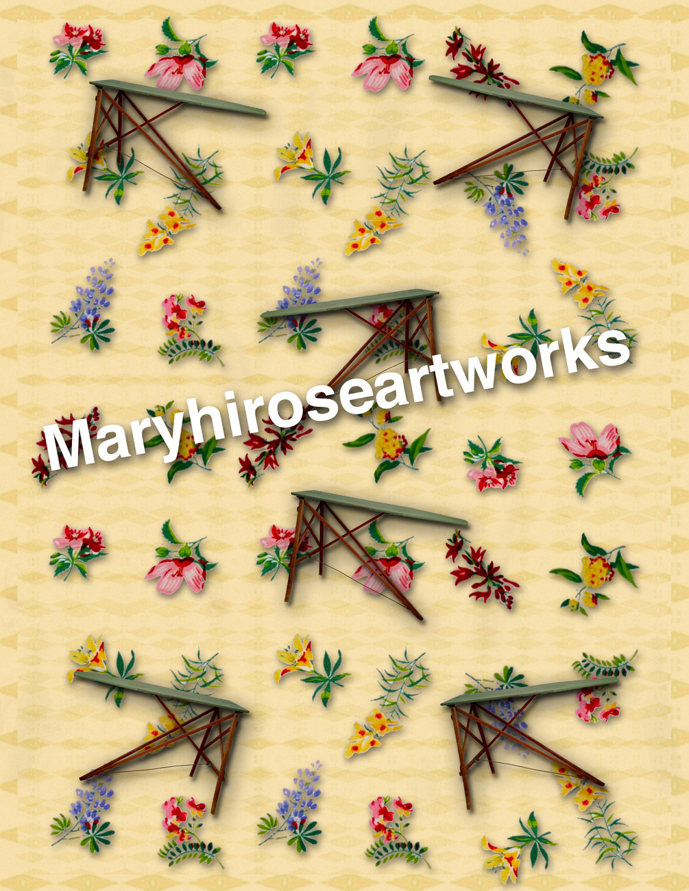 Five instant downloads featuring antique and vintage toasters, teacups, ironing board and red shoes against vintage flowers and a buttery yellow background